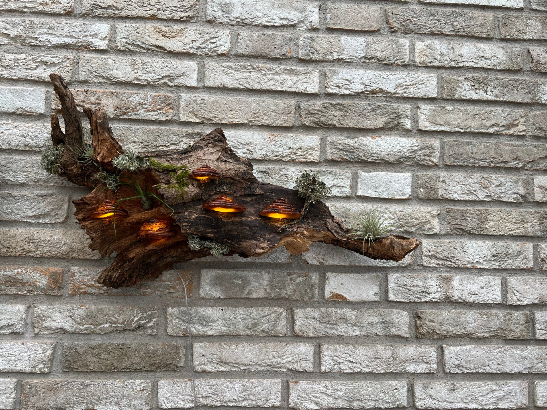 Elk stuk is met liefde gemaakt en bestaat uit een in de natuur gevonden deel van een boom. In elk werkje zijn kleine lichtjes aangebracht.