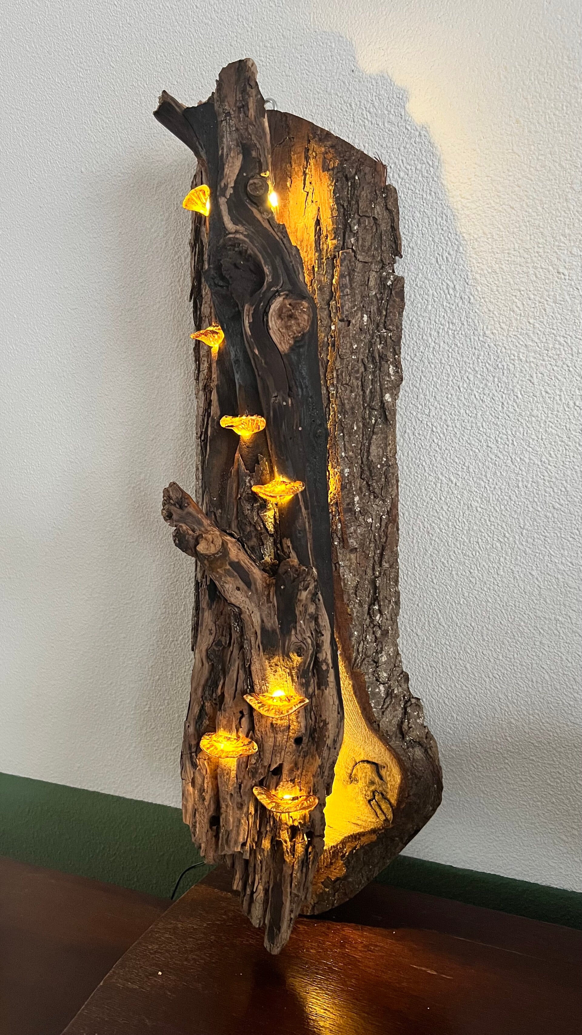 Dit stuk voor aan een muur is uitgevoerd met kleine elfenbankjes. De lampjes geven een warm licht.